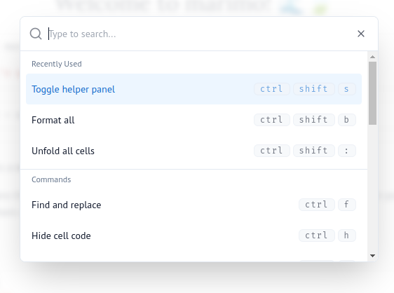 marimo supports context-sensitive right-click menus in various locations of the editor. Right-click on a cell to open a context-sensitive menu; right click on the create-cell button (the plus icon) to get options for the cell type to create.